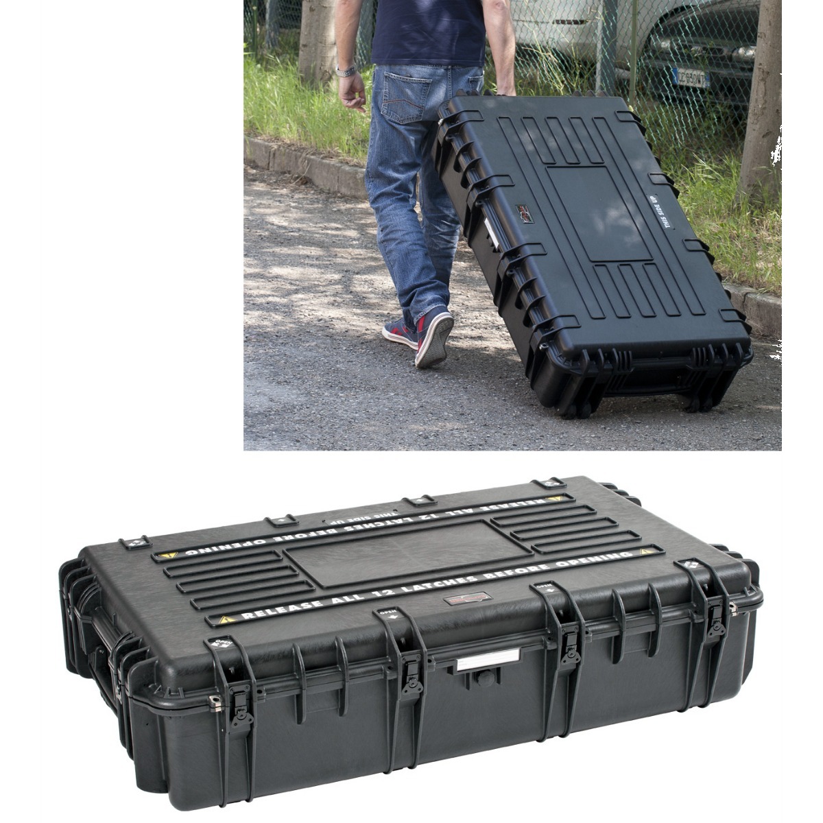 EXPLORER waterproof, black, rolling case, with 3 handles, 12 latches, 16 padlock holes, airline-proof, special interior for 6 rifles, velcroed pocket for mags and accessories, adjustable barrel rests to adapt to the length of your AR guns.