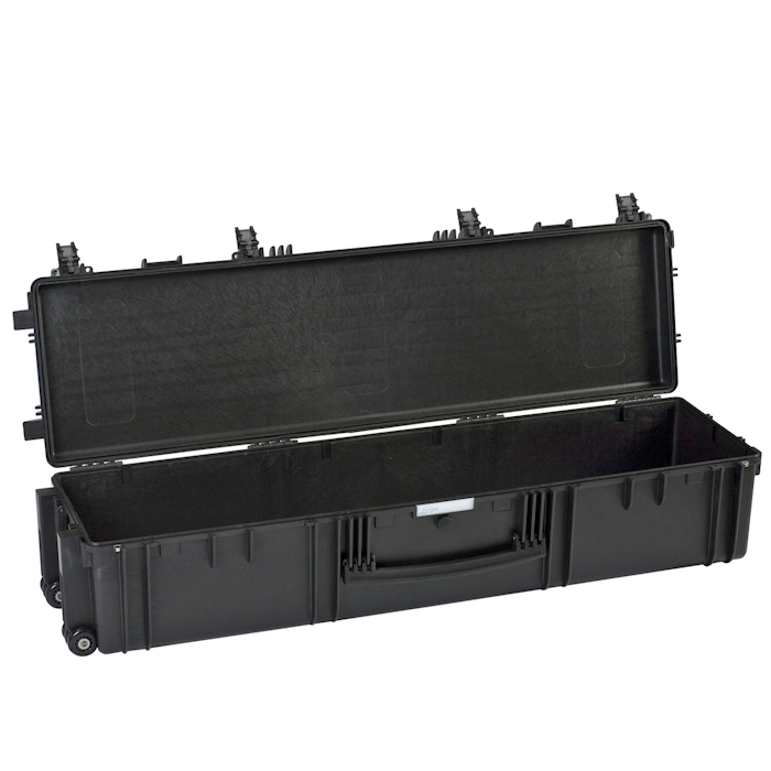 EXPLORER waterproof, black, rolling case, empty, with trolley handle, 8 latches, padlock holes, airline-proof, ideal to carry, protect and ship long probes, golf clubs, tripods.